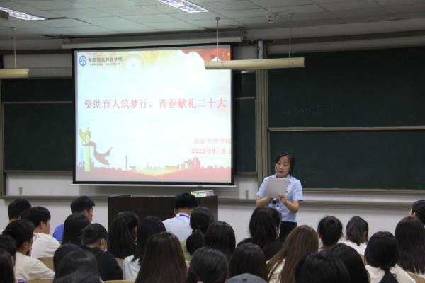 知识改变命运,教育点亮未来。教育是阻断贫困代替传递的治本之策,事关脱贫攻坚的成效和全面小康目标的成色。为了使每位同学都享受教育,不因经济困难失学,旅游管理学院于9月8日晚7点在近思楼302教室举行"资助育人筑梦行,青春献礼二十大"专题大会,思政院长尚园、辅导员老师张晓艳、恒星智业管理咨询有限公司经理孙榕徽、周俊出席本次活动。
