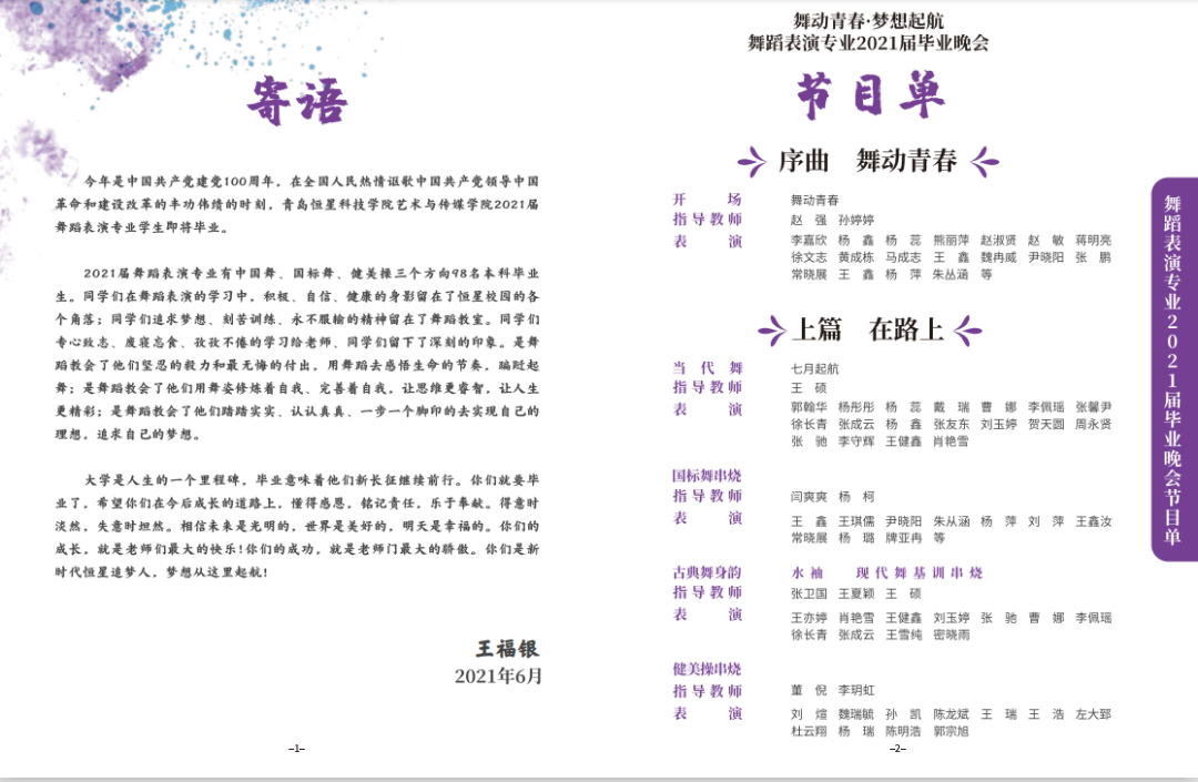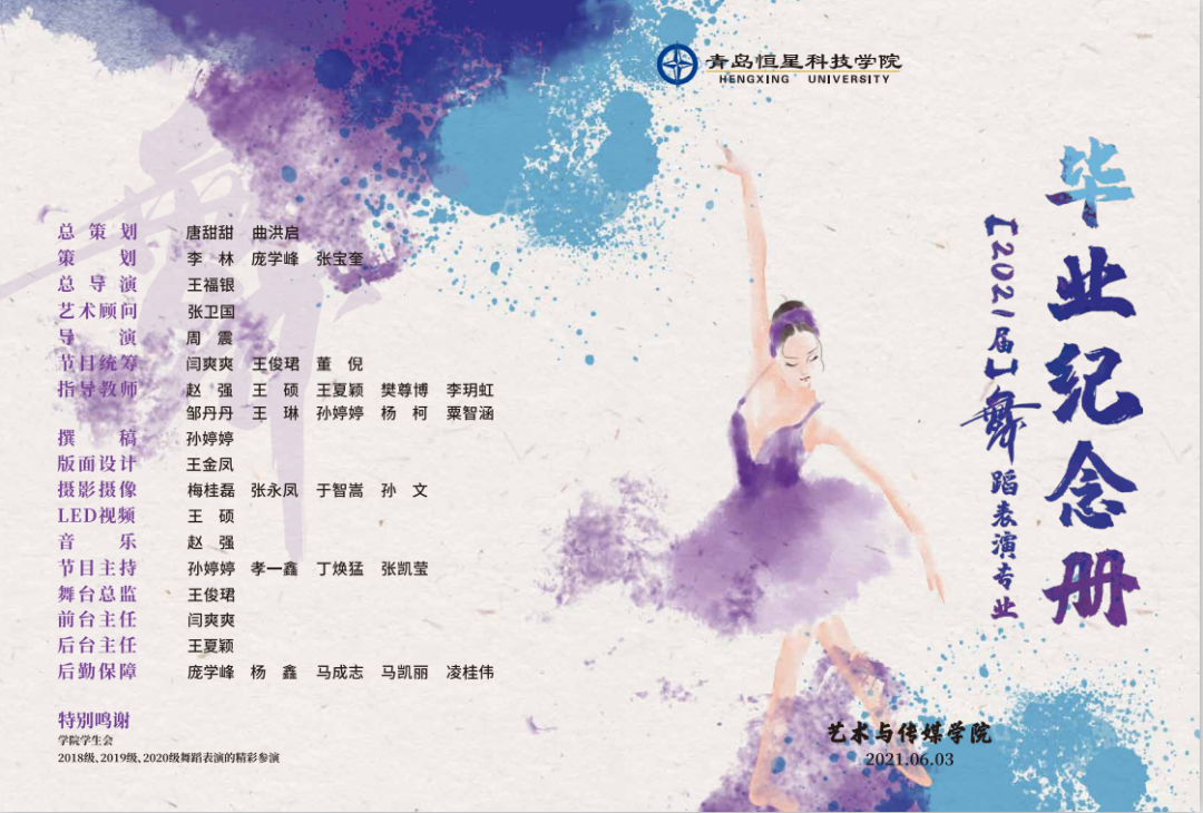 2021年6月3日19:00,青岛恒星科技学院艺术与传媒学院2021届舞蹈表演专业毕业生汇报演出在国际交流中心隆重举办。艺术与传媒学院2021届毕业生,怀揣一颗感恩的心,用最真挚的表演,回馈学校的培育和老师的谆谆教导。