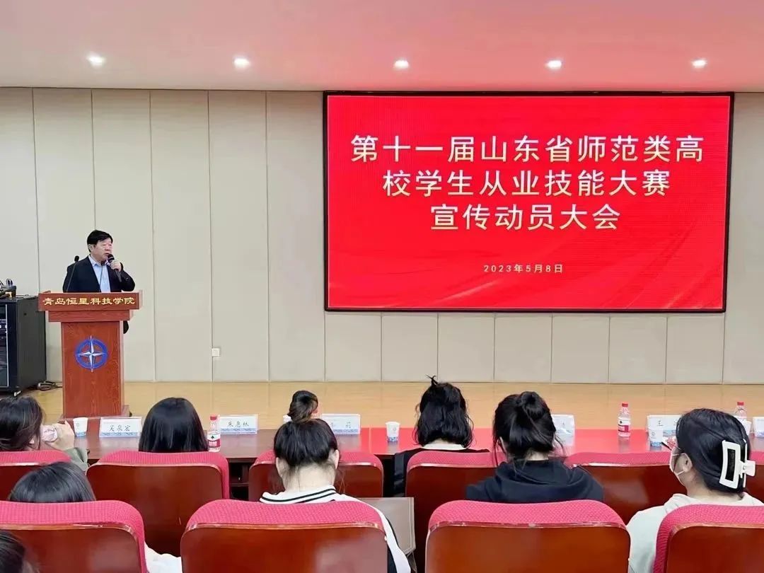 为进一步适应新时代教师队伍建设改革要求,强化师范类高校学生从教基本技能教学与训练,提升师范类高校学生的教学技能、实践能力和综合素质,2023年5月8日,青岛恒星科技学院教育学院在A8-110举行山东省师范类高校学生从业技能大赛宣传动员会。青岛恒星科技学院教育学院院长王冰、教育学院教学院长单菁华、教育学院副书记张雨龙娃等领导莅临本次动员会。