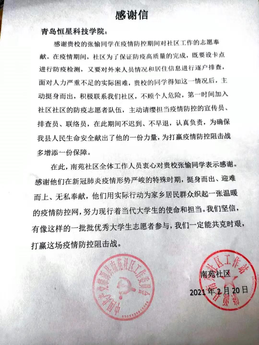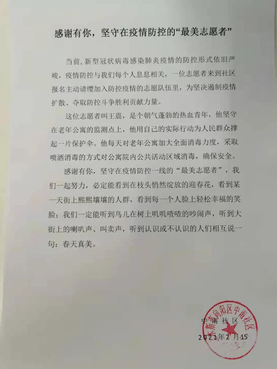 在寒假里参加了社区组织的志愿者活动,为疫情防控做出一些力量,于1月15日开始配合社区隔离工作,1月20日到1月31日在网络宣传防疫知识和注意事项,从二月开始一直进行为黑龙江省佳木斯市地区老年公寓进行消毒工作。