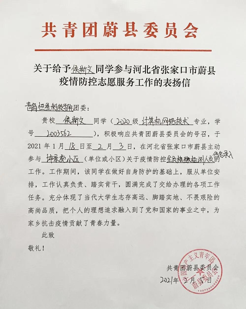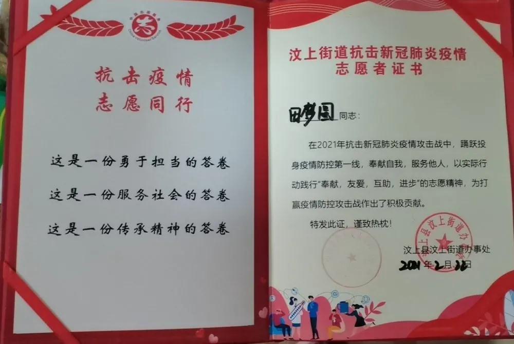 在抗疫期间,参加汶上县汶上街道的志愿者,对小区内每家每户进行走访登记,对外来人员进行排查、登记,对家有外来人员在家过春节登记,并告诉他们去指定地点做核酸检测,然后去小区物业登记做记录。在小区门口站岗,对小区进出人员测量体温,对小区外来人员登记,来往车辆也一一登记,个人名字,性别,拜访人,车牌号码严格记录,非常重视人员出入和外来人员