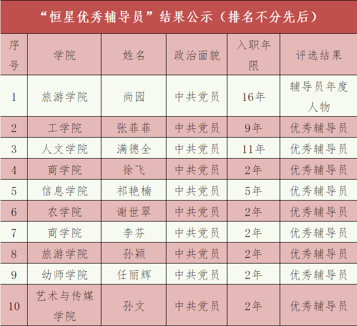 本次评选活动分别从理想信念、师德师风、素质能力、育人实效、敢于担当等方面对参评老师进行考察。整个评选的过程秉承着公平、公正、公开的原则,经学院推荐、自我展示、现场答辩等环节,共评选出“恒星优秀辅导员”10名。