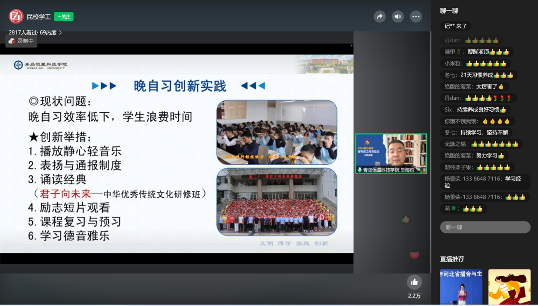 在发言中,毕海豹书记阐述了大一新生在开学初期会遇到的问题,为帮助新生尽快适应大学生活,实现德智体美劳全面发展,学校抓住学生成长的灌浆期,以“传承文化、培养习惯、促进成长”为核心,通过21天的持续实践,引导学生养成良好的学习、生活及锻炼习惯,从他律到自律、从完全被安排到半安排,最终过渡到良好的自我管理学习方式。具体包括:第一,开设新生入学教育泛学课程;第二,依托学校“一站式恒星大学生成长计划平台”,进行职业测评;第三,制定晨跑计划;第四,开展光盘行动、倡导光盘打卡;第五,开展团辅活动,凝练班级风气。第六,实施创意晚自习计划,通过播放静心音乐、诵读经典,观看励志影片等,让晚自习生活丰富多彩。