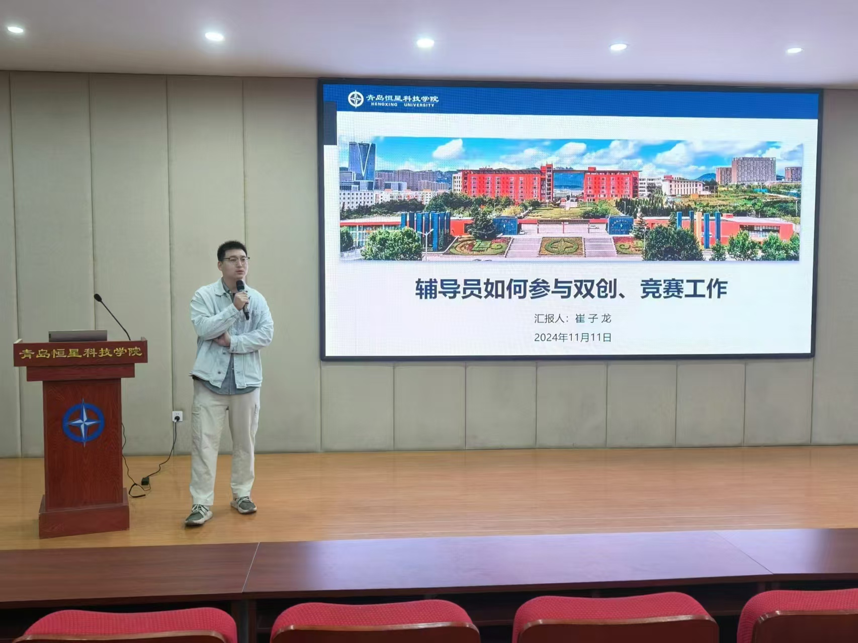 外出培训代表崔子龙老师从几个方面对“辅导员如何参与双创、竞赛工作”进行相关介绍。