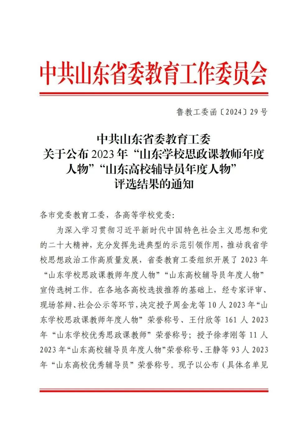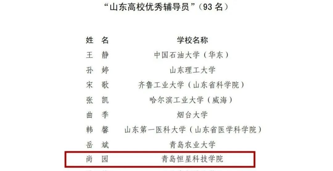 近日,中共山东省委教育工委公布了2023年度“山东省高校优秀辅导员”评选结果,我校旅游管理学院党总支副书记尚园荣获“山东高校优秀辅导员”称号。