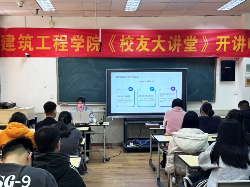 讲座伊始,于祥运校友深情回忆起在母校度过的学习时光。他感慨时光飞逝,那些为梦想拼搏的日子仿佛就在昨天,同时殷切寄语学弟学妹们珍惜在校时光,脚踏实地,为未来的发展积累知识与力量。随后,于同学深入分享了建筑行业的前沿动态,他提到如今绿色建筑和智能建造已经成为行业发展的两大重要趋势。随着环保意识的不断增强,建筑行业致力于减少对环境的影响,实现可持续发展。而智能建造则借助数字化技术,如BIM、大数据、人工智能等,提升建筑工程的效率和质量,让建筑项目的管理更加精细化、智能化。这些前沿信息,让同学们对未来的学习和职业规划有了新的思考。