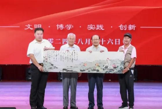 在讲座现场,陈昌金董事长为严晓蒸部长颁发了"专家咨询委员会委员"聘书,为陈志刚主任、肖秋成老师颁发了"客座教授"聘书。自此,我校与健康中国工程进一步加深联系,为学生的健康成长奠定了深厚基础。肖老师向陈昌金董事长现场赠送内容为教书育人的亲笔画作,寓意恒星的教育事业生机勃勃、源远流长。