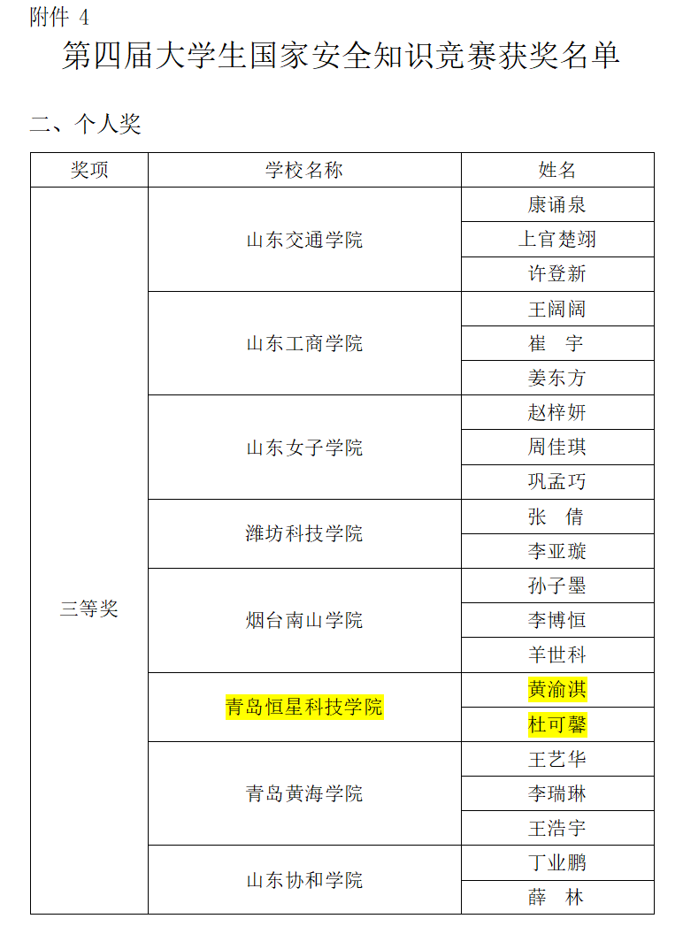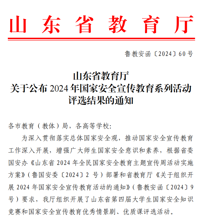 近日,由山东省教育厅公布的2024年国家安全宣传教育系列活动评选结果中,我校机械与汽车工程学院黄渝淇、国际教育学院杜可馨两位同学在山东省第四届大学生国家安全知识竞赛中荣获个人奖--三等奖。