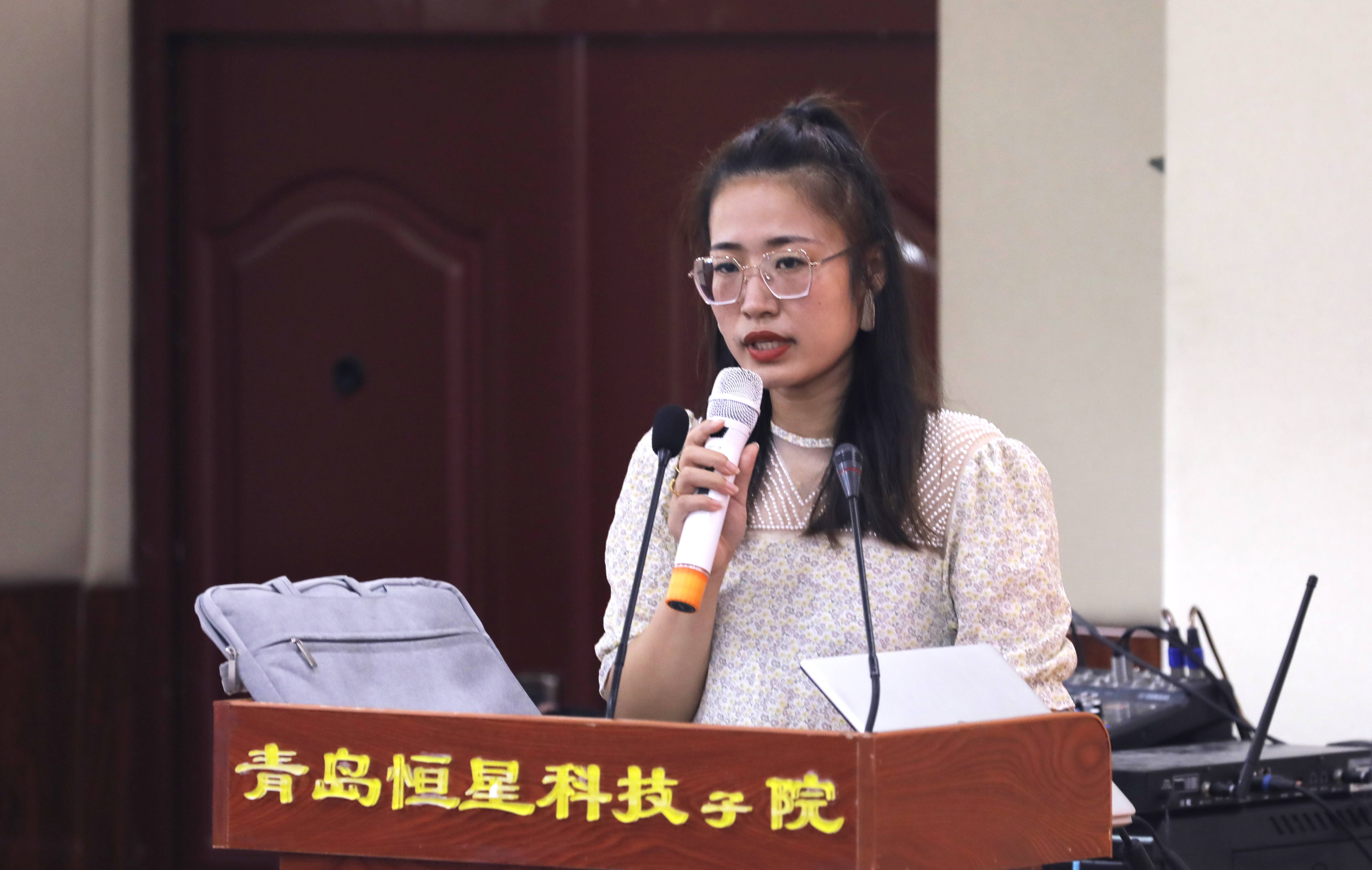 随后,青岛恒星科技学院2021年度“金牌辅导员”刘笑君老师作为学员代表进行发言,她表示辅导员工作过程辛苦但结果却让她很欣慰,看到学生一步步的成长的同时,也让她真正感觉到了自己工作的价值与意义。