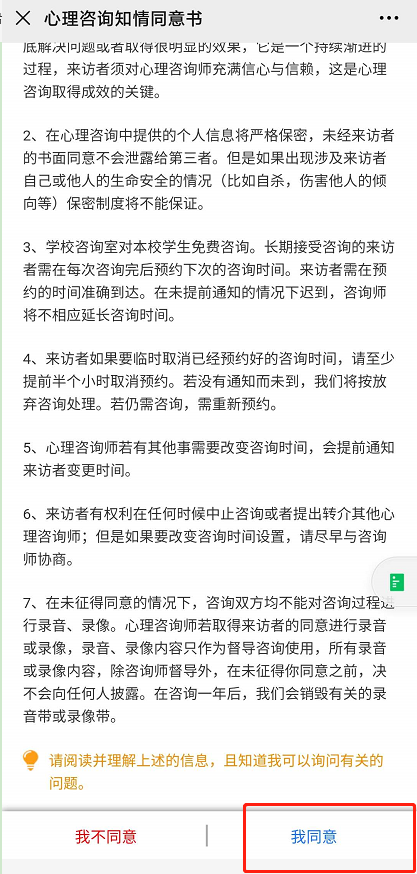 (二)查看心理咨询知情同意书,认真阅读后,选择【我同意】;