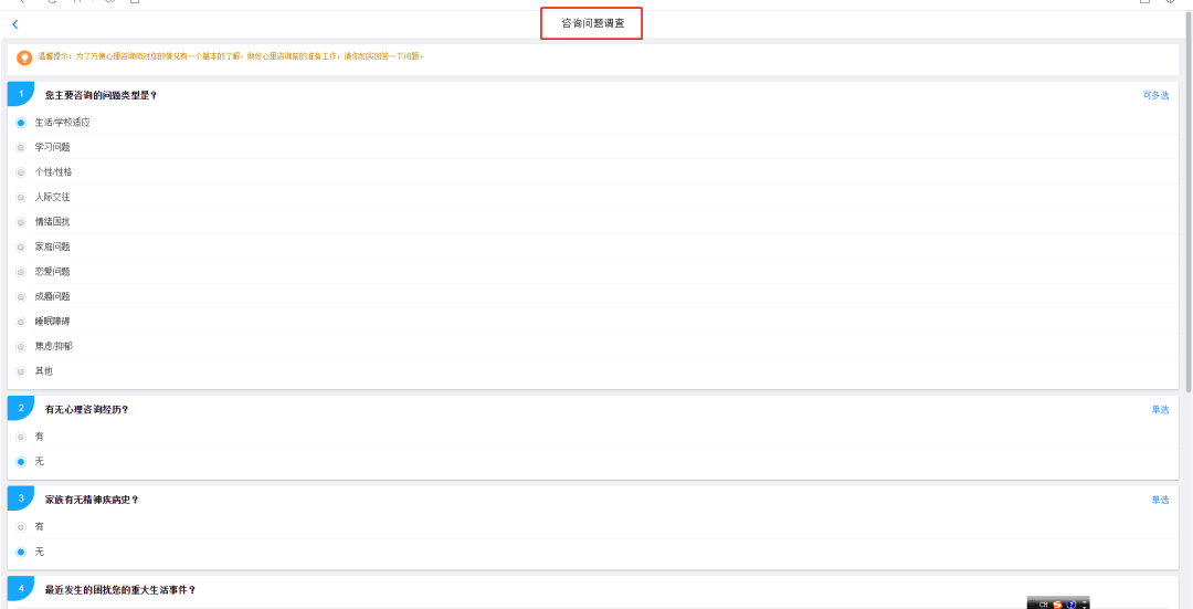 (六)进入到咨询问题调查界面,根据自身情况,如实选择自己要进行咨询的问题(可单选、可多选);