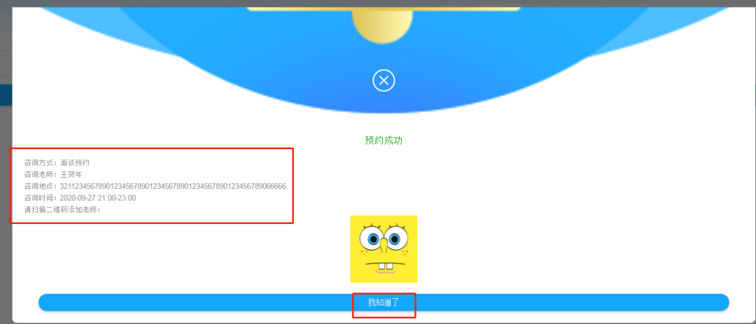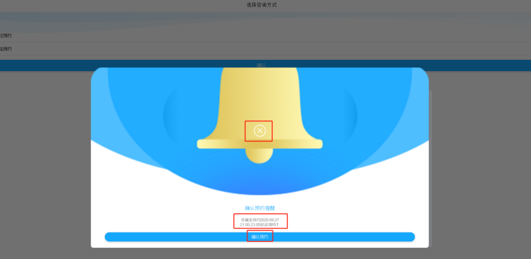 (九)确认咨询方式后,弹出【确认预约】界面,在弹出的界面中确认预约时间段无误后,点击下方【确认预约】按钮,不想预约点击上方按钮退回上一界面,点击确认预约后,弹出【预约成功】界面,左侧是预约的信息,无误后点击下方【我知道了】,跳转到【预约成功确认】界面,点击确认后跳转到【咨询记录】页面可查看预约记录。