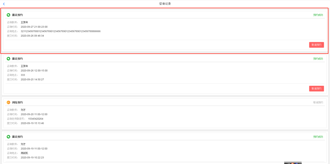同学们可用此功能查看自己的预约记录,对于已完成的预约可以评价、查看评价以及心理咨询师给出的咨询结论;对于未开始的预约,在时间允许的范围内可以取消。