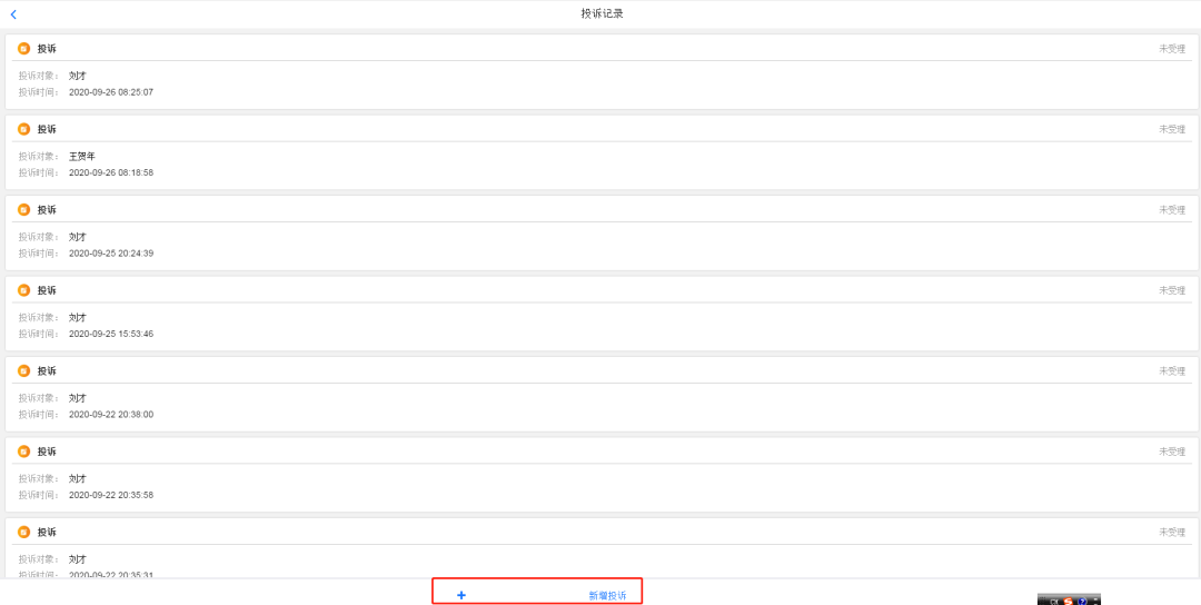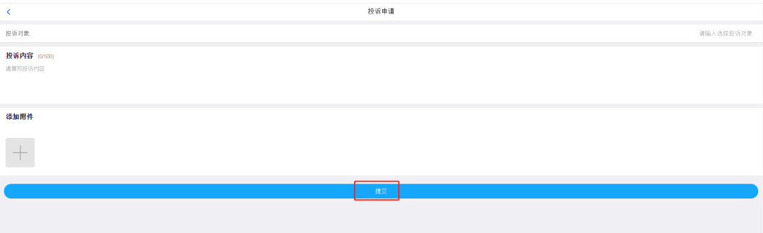 (三)在投诉申请页面,在下拉框中选择投诉对象、投诉内容等信息,点击下方【提交】按钮可确定提交,在投诉记录页面等待受理即可。