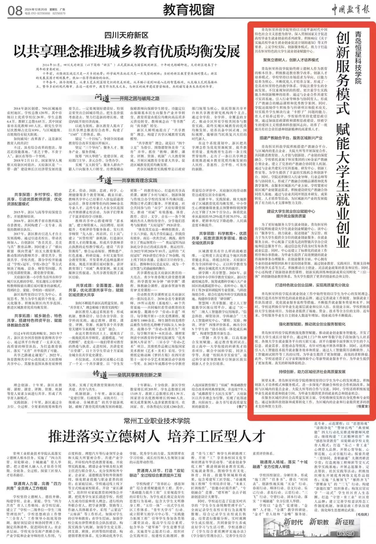 12月20日出版的《中国教育报》特别报道了“青岛恒星科技学院:创新服务模式,赋能大学生就业创业”,点赞青岛恒星科技学院发挥自身优势和专业特色,创新服务模式,创新人才培养模式,强化数智赋能,为社会培养大批优秀人才。