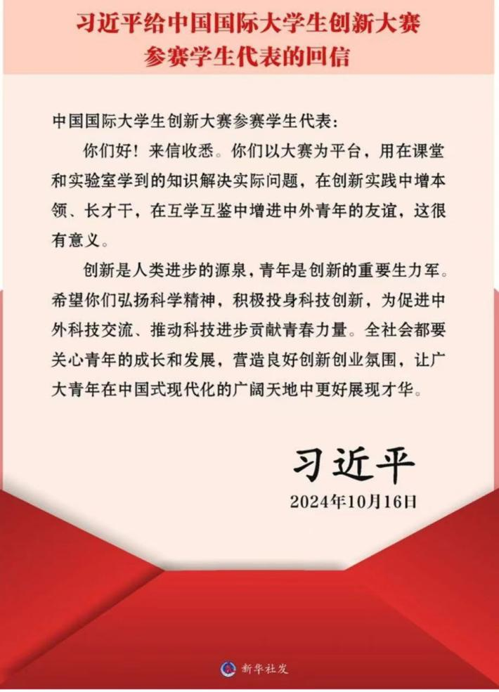 10月16日,中共中央总书记、国家主席、中央军委主席习近平给中国国际大学生创新大赛参赛学生代表回信,对他们予以亲切勉励并提出殷切希望。