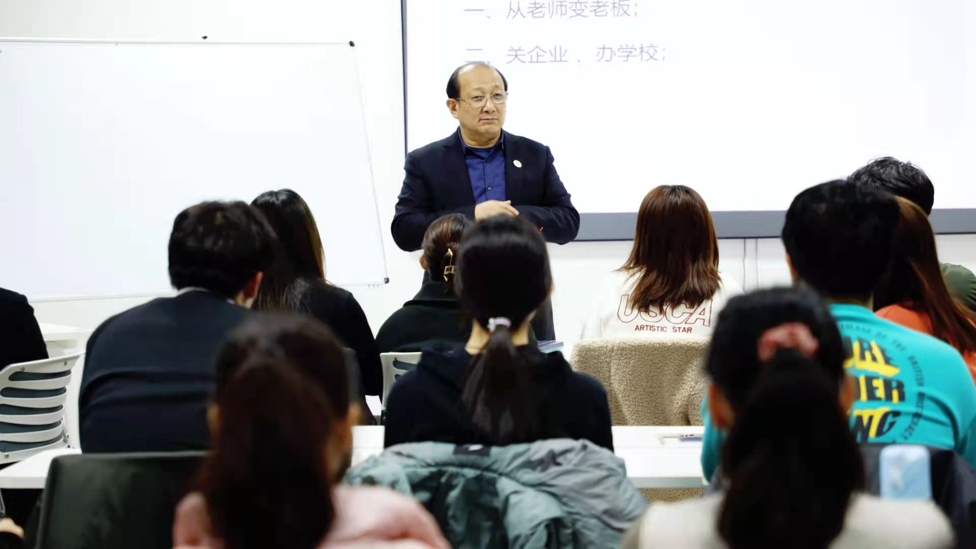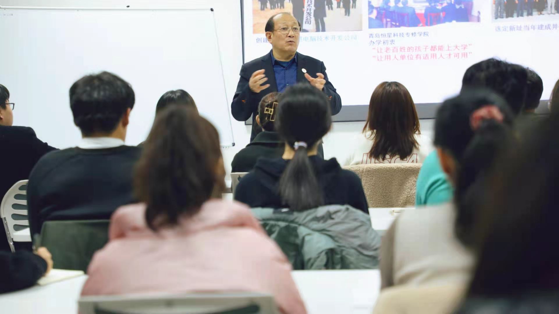陈校长以自身创业经历为主线,讲述了作为一名山东化工学院(现青岛科技大学)教师,从维修力学实验仪器设备就开始大胆创新实践,自学计算机维修技术,先后设计开发三坐标计量仪、毛条染色系统及出租车计价器。1988年,注册成立青岛即墨电脑技术开发公司。2000年,创建青岛市政府最早认定的民营高新技术企业集团----青岛恒星集团有限公司。2002年创办了青岛恒星职业技术学院,创新学校的办学模式、教学模式。