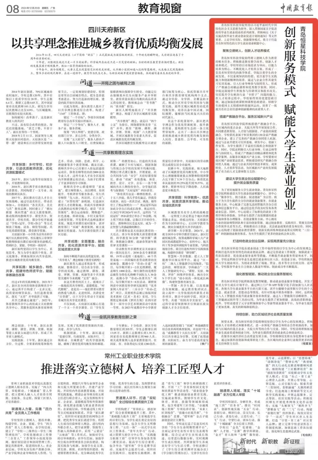 近日,《中国教育报》报道我校“青岛恒星科技学院:创新服务模式,赋能大学生就业创业”,点赞我校发挥自身优势和专业特色,创新服务模式,创新人才培养模式,强化数智赋能,为社会培养大批优秀人才。
