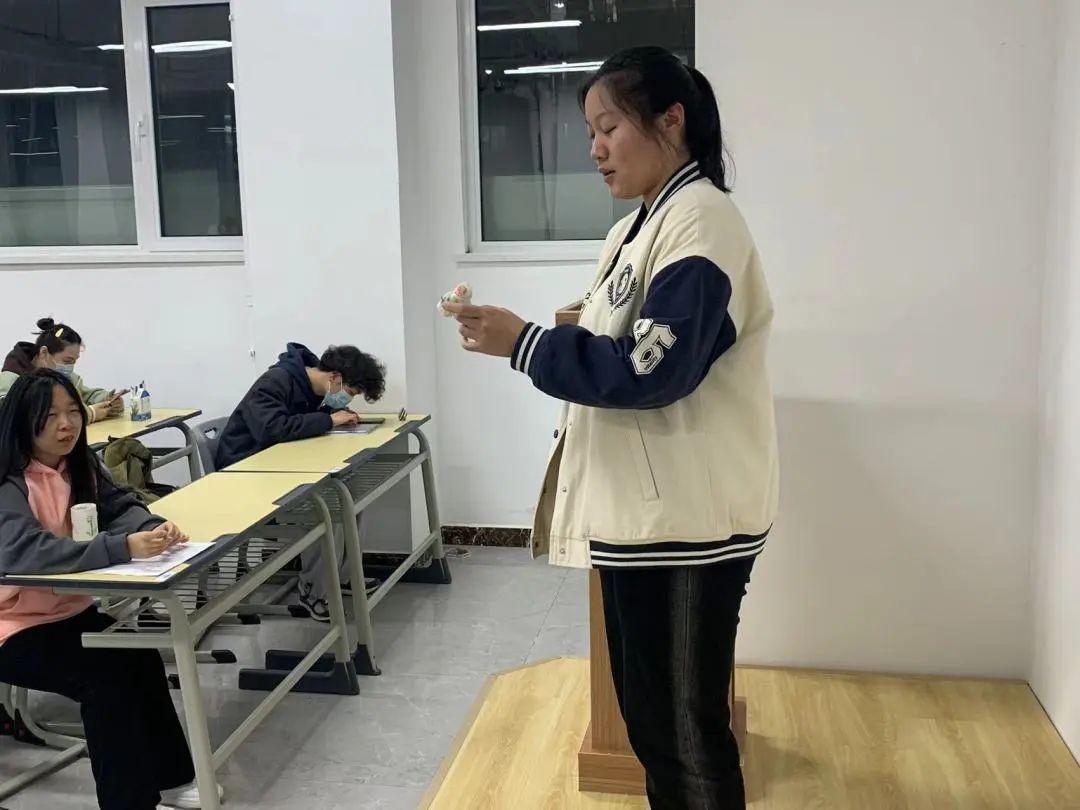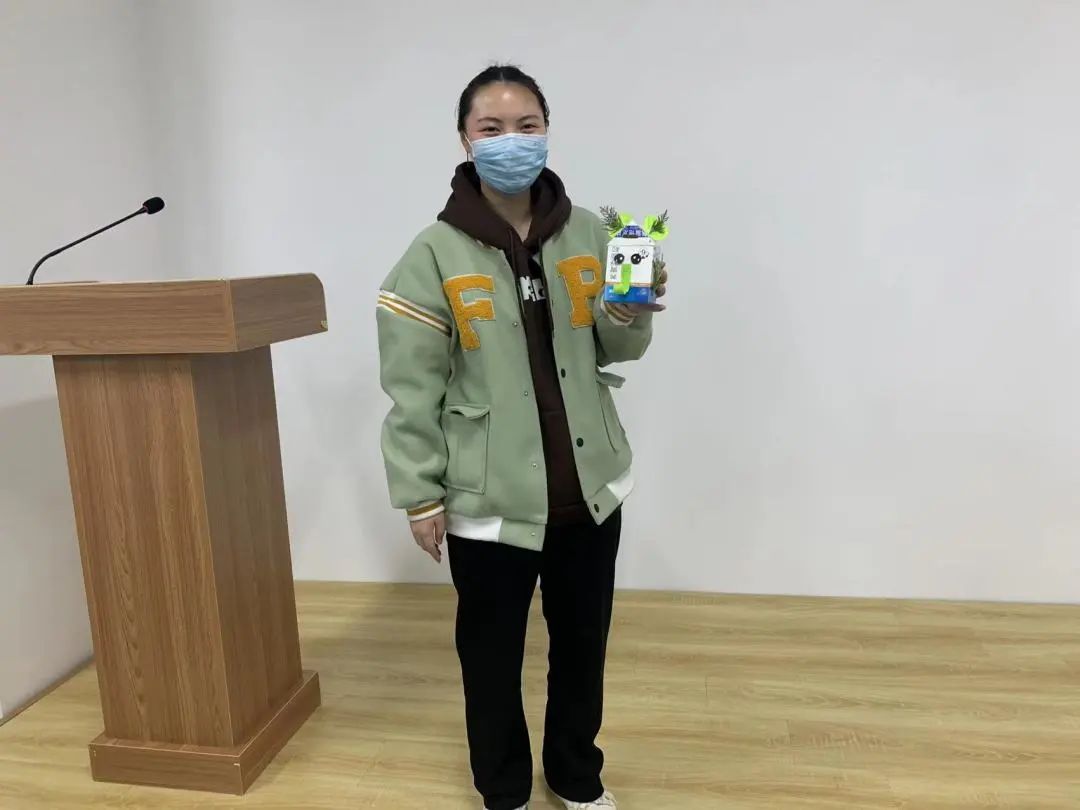 主持人介绍过后,同学们有序地上台展示自己的作品及创意理念。同学们有的将喝过的饮料瓶做成了笔筒,有的将废纸和棉签做成了桌面摆设,有的用废纸箱做了一个书签、手机支架、小型收纳箱……