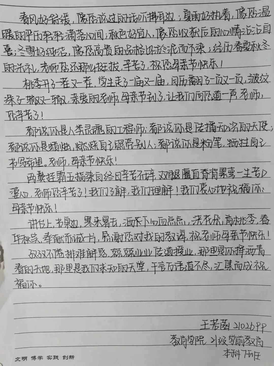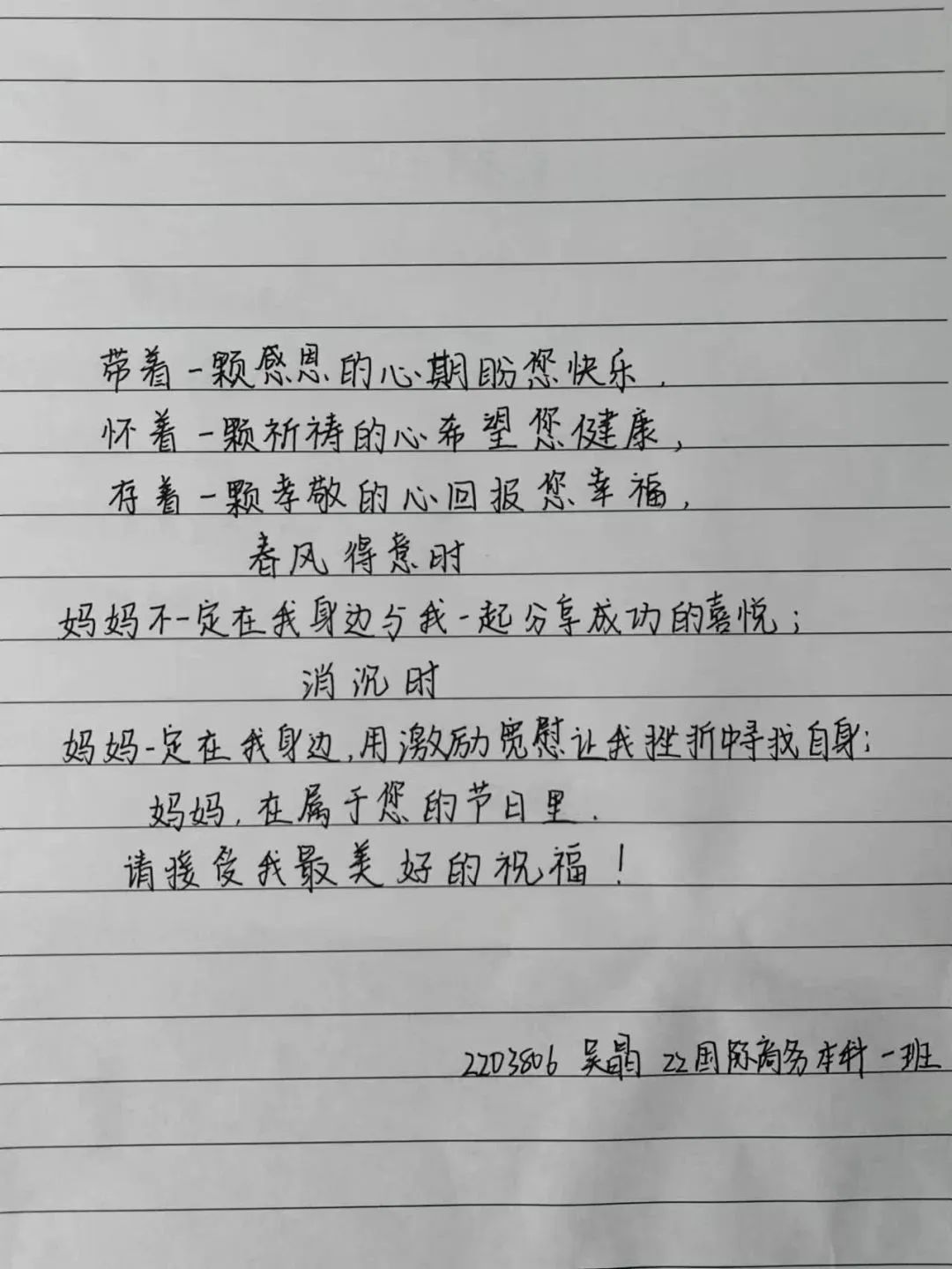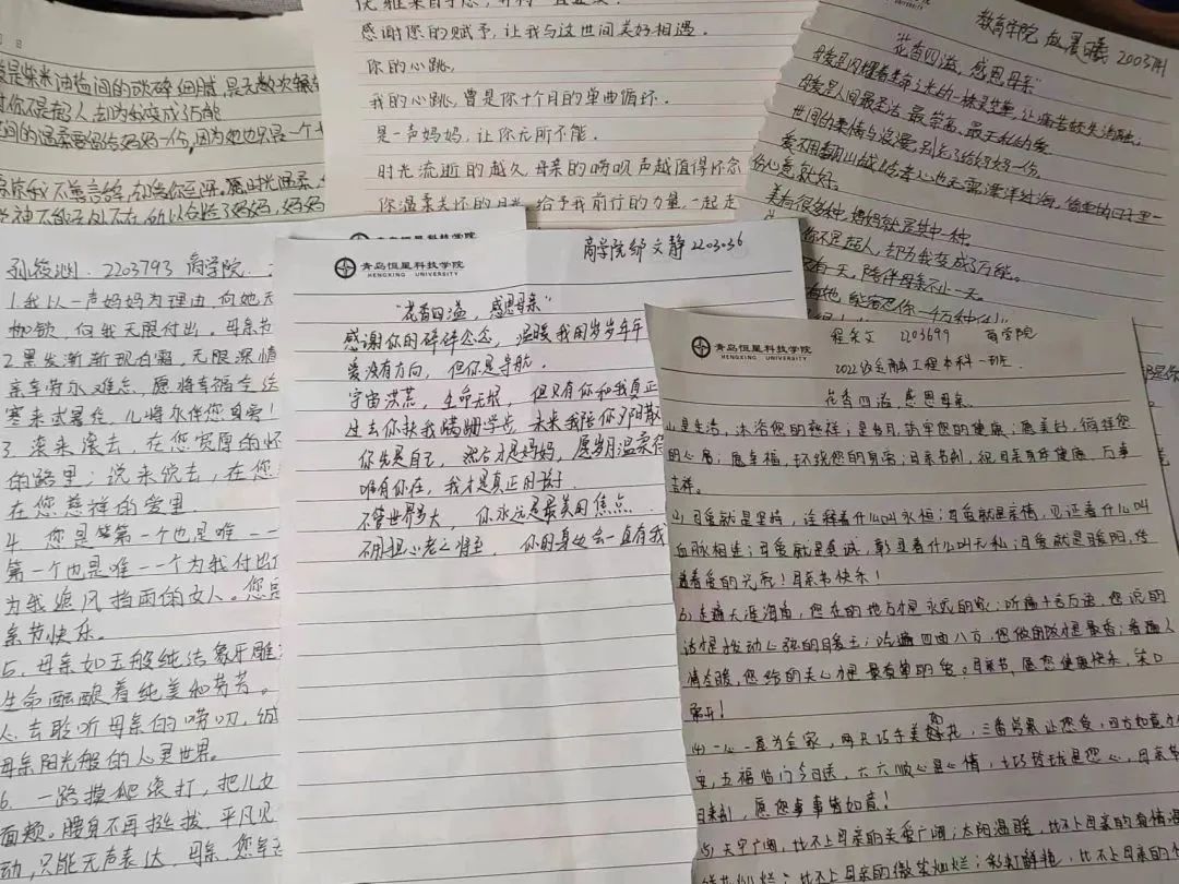 本次活动开展后有很多同学都积极地参与其中,用文字的形式表达了对母亲的真实情感,片语之间皆是浓情,用真挚的文字传递对母亲的深情厚谊,记录对母亲的感谢、祝福和回忆,为母亲献上最温暖的祝福。
