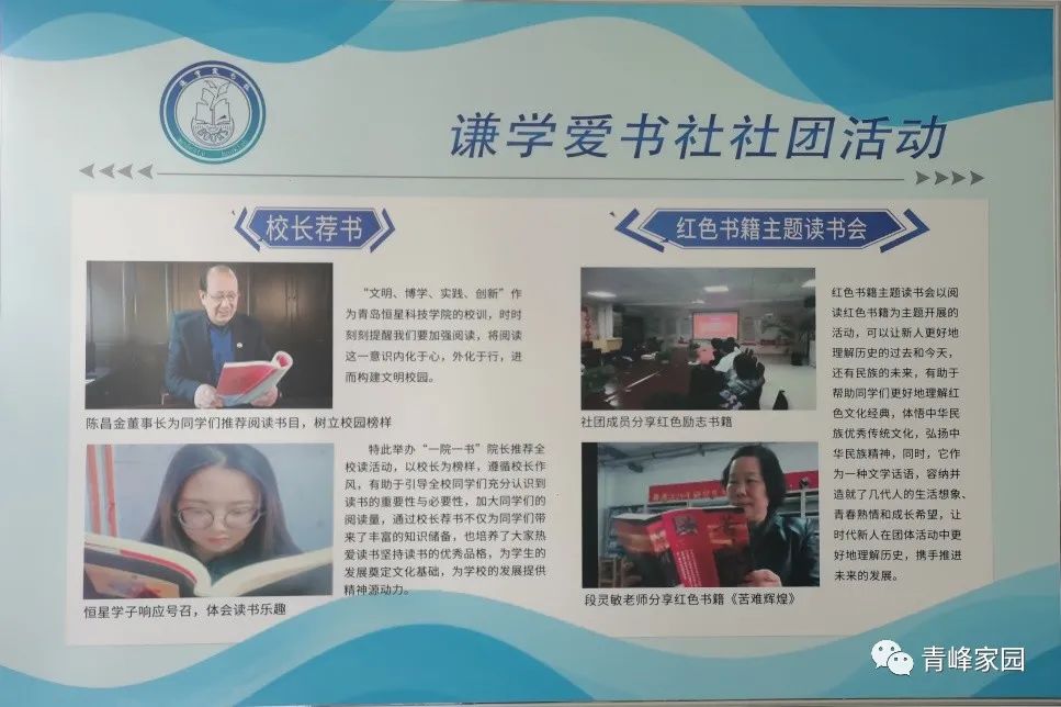 谦学爱书社团是在青岛恒星科技学院团委领导下,由青岛恒星科技学院学生自主发起的学生社团组织。社团依托学校图书馆资源,组织校内读书爱好者进行文化交流,辅助图书馆老师进行工作研究、书籍整理分类以及在图书馆举办促进全校师生学习进步的课余活动。
