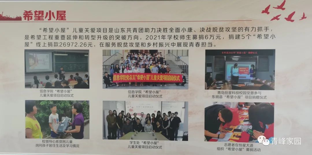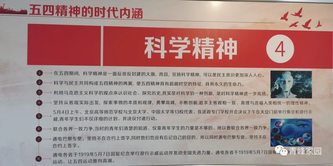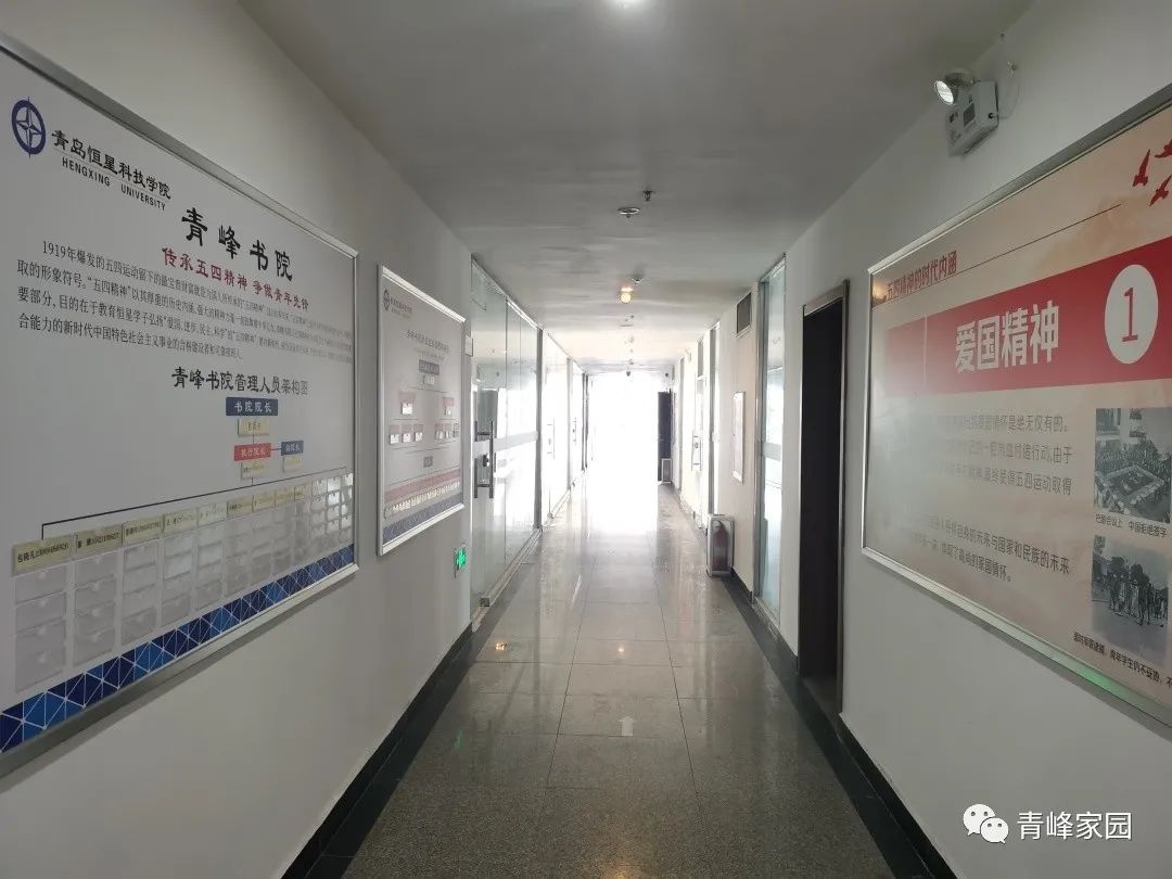 青年是国家的未来,为弘扬五四精神,坚定青峰书院学子的理想信念,青峰书院的两侧走廊,一侧宣传五四精神的时代内涵和团的光辉历程,鼓励青峰学子不忘初心、砥砺品德;一侧展示恒星学子抗击疫情、建设希望小屋工程等热血行动。