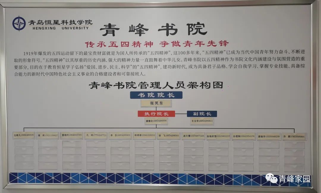 青峰书院以五四精神作为书院文化内涵建设与氛围营造的重要部分,目的在于教育恒星学子弘扬“爱国、进步、民主、科学”的“五四精神”,建功新时代,成为具备君子品格、学会自我学习、掌握专业技能、具备综合能力的新时代中国特色社会主义事业的合格建设者和可靠接班人。