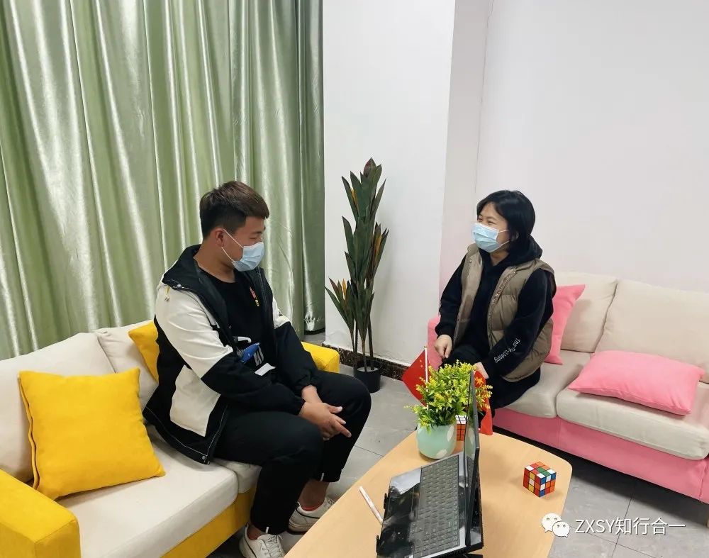 知行书院祁艳楠老师在书院一楼心灵驿站与同学谈心。如今封校形式下,同学们不能外出散心,与人交流仅局限于宿舍内。封闭条件下,同学们多少会产生一些消极心理,在这时同学们可以到心灵驿站与值班老师进行谈心。