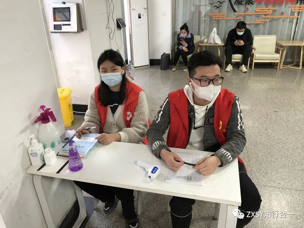 知行书院出入口值班人员为工学院李世伟、商学院轩雨晴,为同学们测量体温,叮嘱同学们佩戴好口罩。